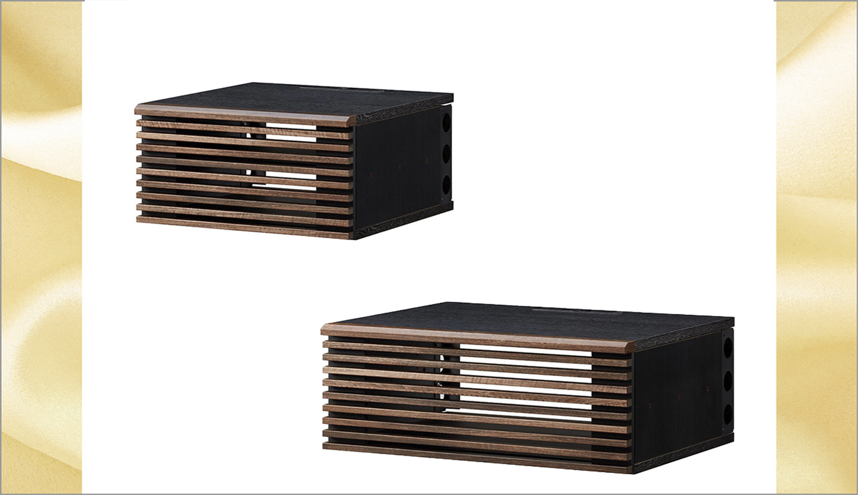興味深いのは機能性。配線に手前からアクセスできるよう、脚部にはマグネットキャッチのカバーがあり、それが鏡となっているので向こう側まで床が抜けているように見えます。背面には、壁コンセントへの切り欠き、巾木を避けて壁ピタできる構造も。さらに、天板にはリモコンの赤外線信号を収納機器へと伝播するエミッターも用意するなど、カスタムインストーラーに勝るとも劣らない、細やかな配慮が行き届いています。