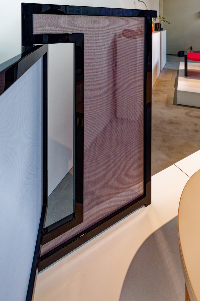 マットがトレンドのいま80年代の光沢や直線を意欲的に持ち込むことで、家具のフォルムのみならず、建物と空間と家具というインテリアのL/M/Sの境界線までも意識させます。