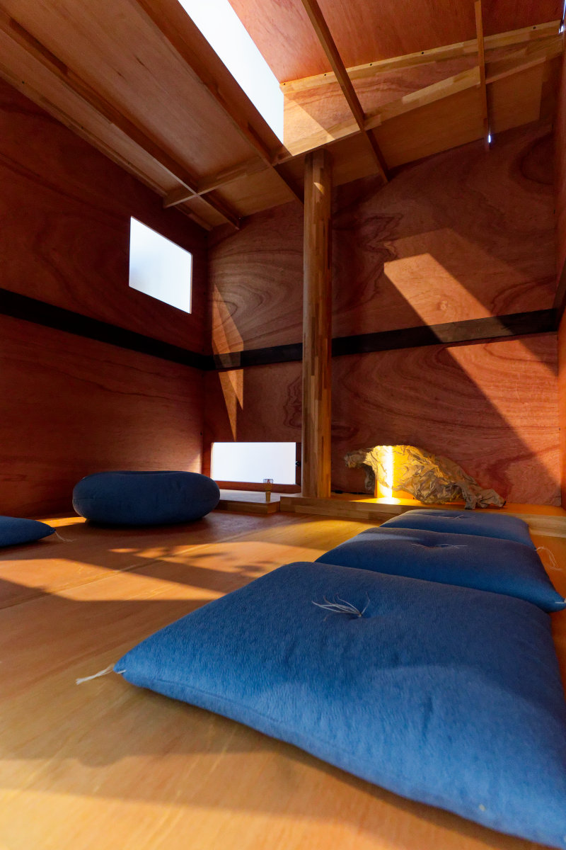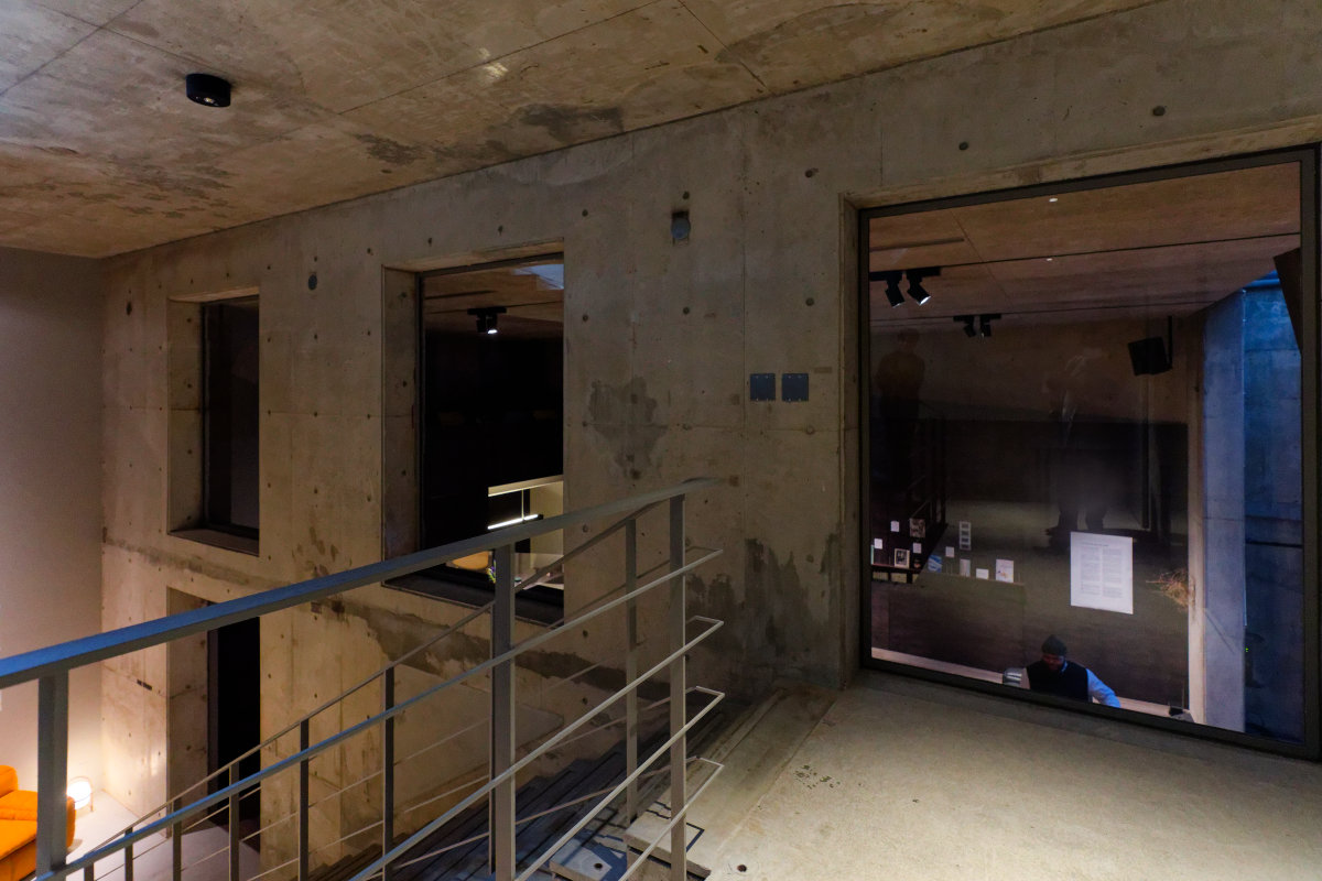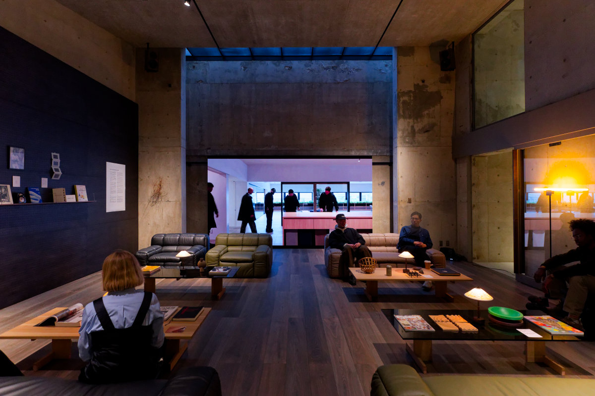 KARIMOKU RESEARCH CENTERの地下にもイベントスペースとなる広大な空間「THE STUDY」が。ソニーの200インチディスプレイによるサイネージと、DYNAUDIOのスピーカーが設置され、今という瞬間を愉しむことの大切さを気づかせる仕掛けです。