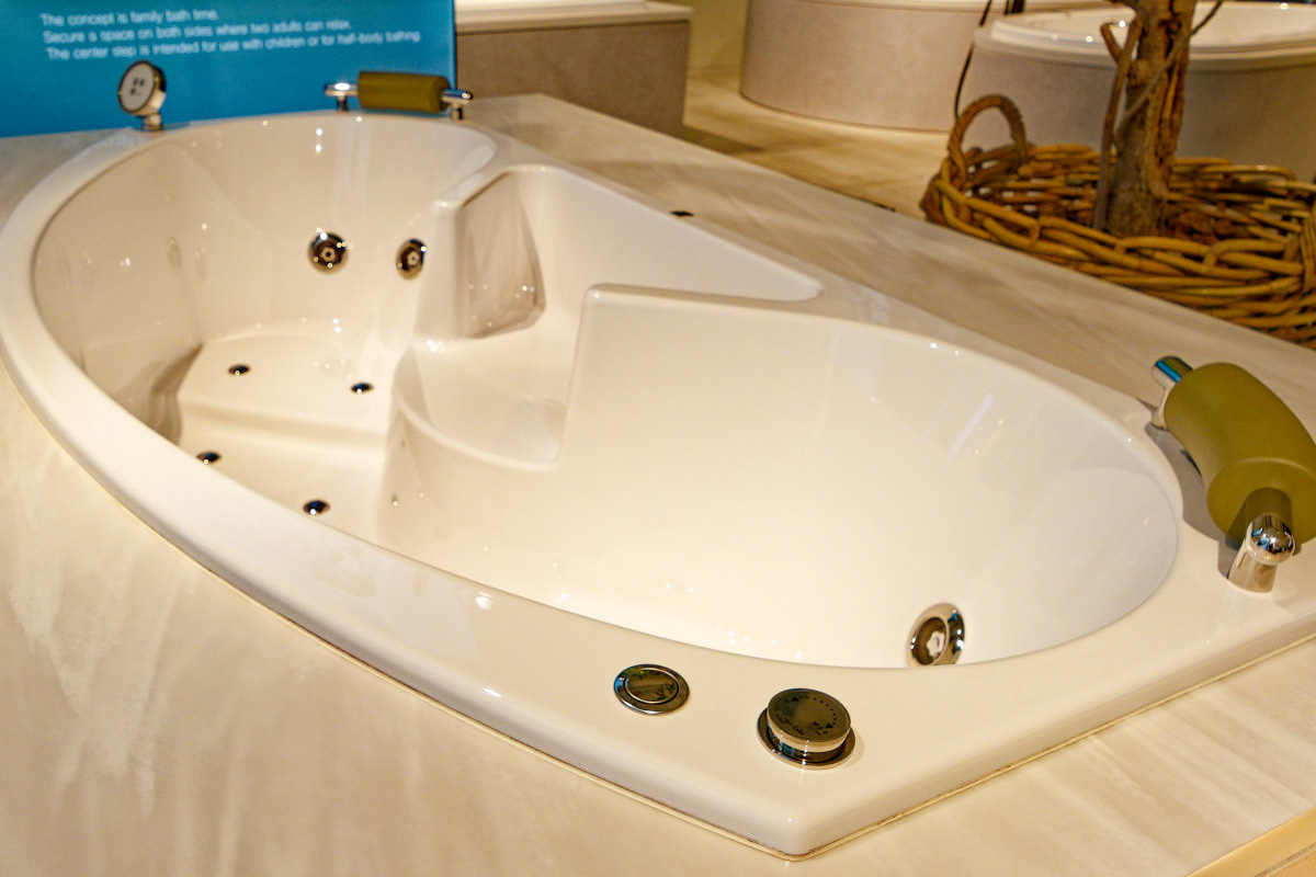 埋め込みタイプの “ザ・スタンダード”。写真左側の座面が少し傾斜しており、対面は脚置きにも。逆に右側は半身浴ではお尻にフィットする半身浴を、左段差はフットレスト代わりになり安定した姿勢を保てます