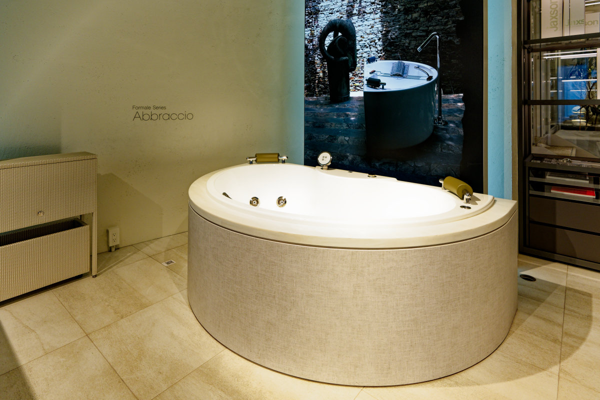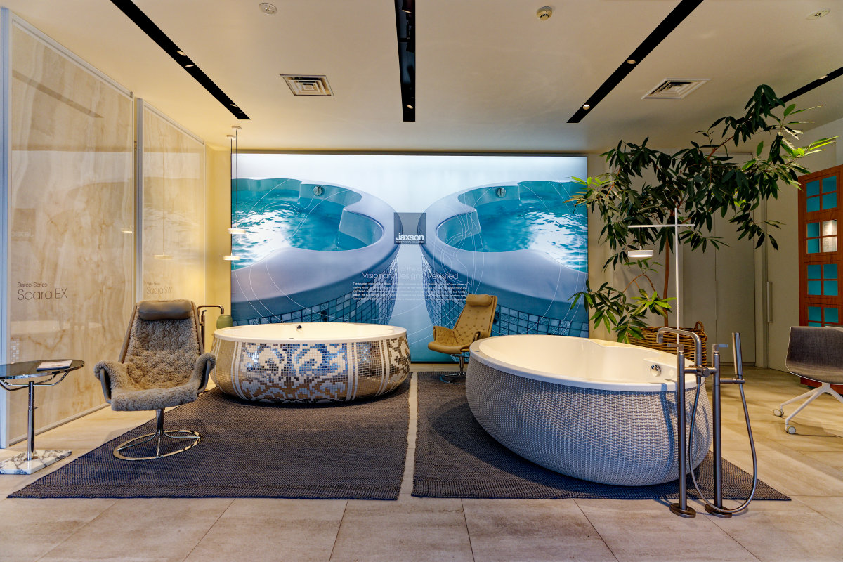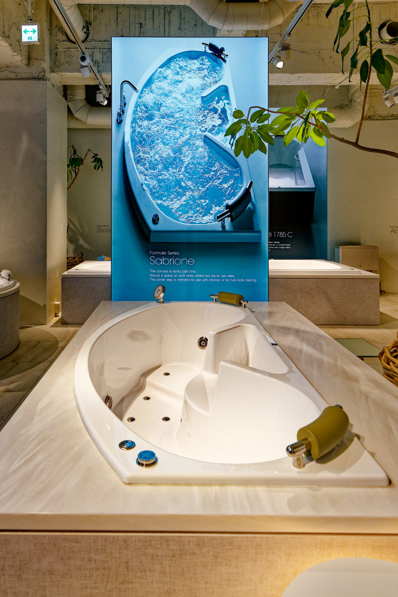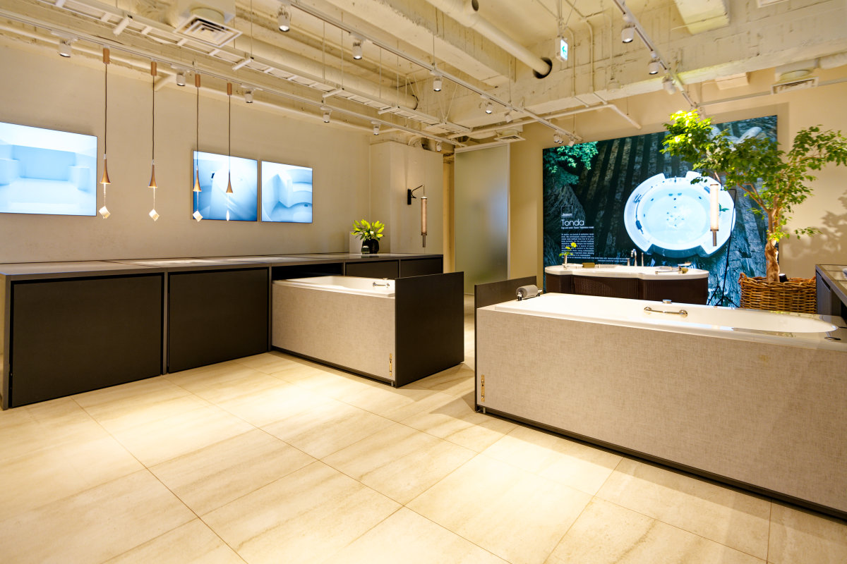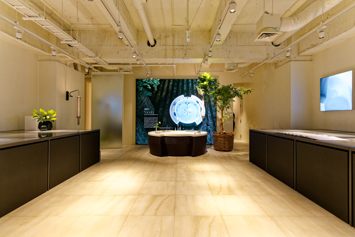 - 東京・赤坂にあるブランド直営ショールーム「JAXSON TOKYO」では、5ゾーン27モデルのバスタブを巡りながら、意匠照明、ガラス収納、高級水栓などとのコラボレーションも体感できます