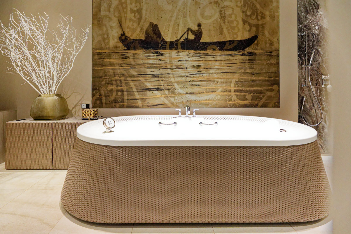 意匠もイタリアのトレンドを先取りした素材を用いるのが特徴で、アウトドア家具やイタリアのモザイクタイル、古代ヒノキ等の木とのハイブリットも、ジェットバス機能とともにJAXSONブランドのアイコンとなっています。カバーリングはヨーロッパ高級アウトドア家具の製造を担うセブ島の工場にて手編みで仕上げたものをバスタブにセットしています。