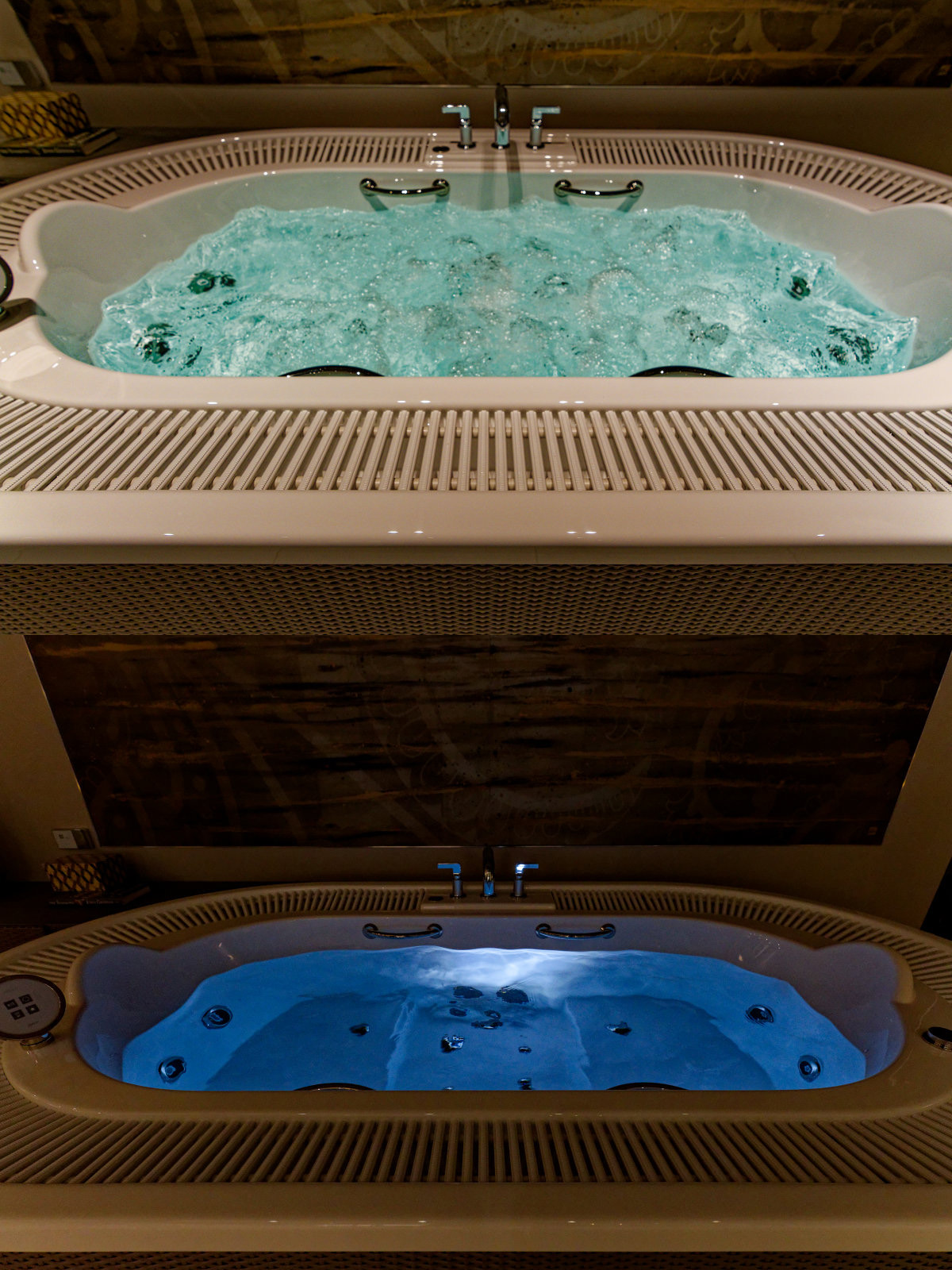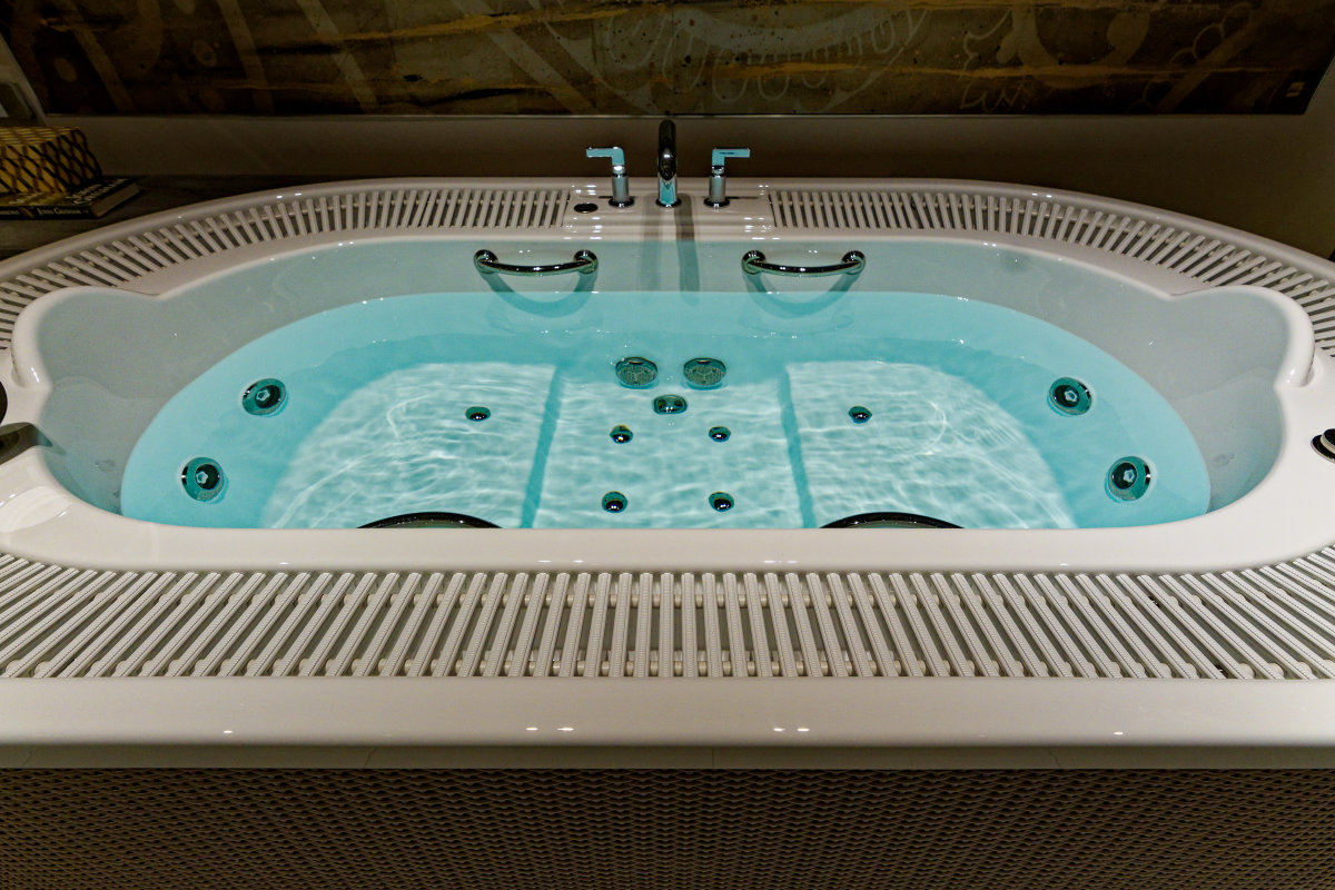 イタリア語で「大きくて丸い」。ブランドを代表するフラッグシップモデルで、周囲のグレーチングにお湯をあふれさせて温泉のように贅沢に使える “二人掛け” 仕様のチェアを備えた大型バスタブ。スパのような使い方が可能