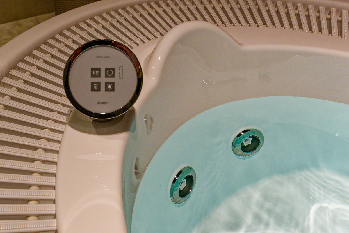 - JAXSONの特徴のひとつ、ジェットバス。マッサージ効果を得たいときは背中からのジェット、リフレッシュしたいなら下から気泡が吹き上がるブロア、静かに音楽を聴きたいときは水中照明だけでムーディーに…といったようにシーンが選べます