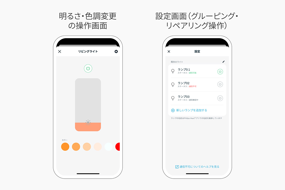 • オン/オフ、明るさ変更、色調変更の操作が可能。オートメーションやシーンにも対応