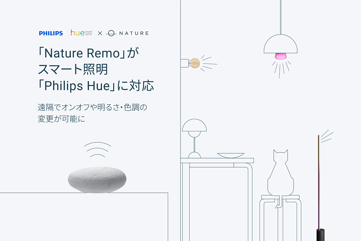 スマート照明「Philips Hueシリーズ」がNatureのスマートリモコン「Nature Remo Lapis」など3モデルとの対応を開始しました。通常Philips Hueの遠隔操作には、専用ハブである「Hue ブリッジ」およびネットワーク連携が必要となりますが、今回のアップデートによって、Nature RemoとPhilips Hueを連携させるのみでコントロールが可能になりました。
