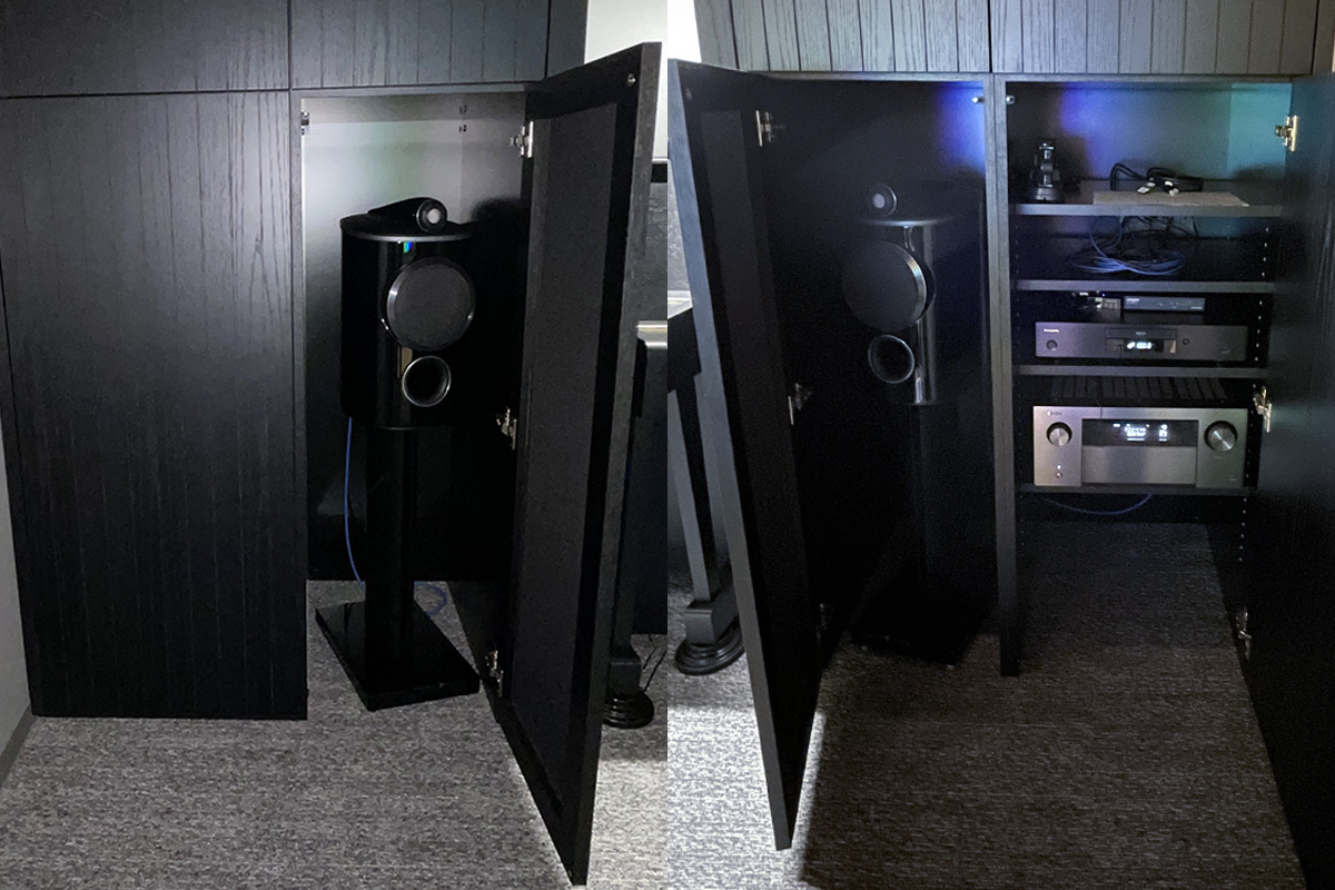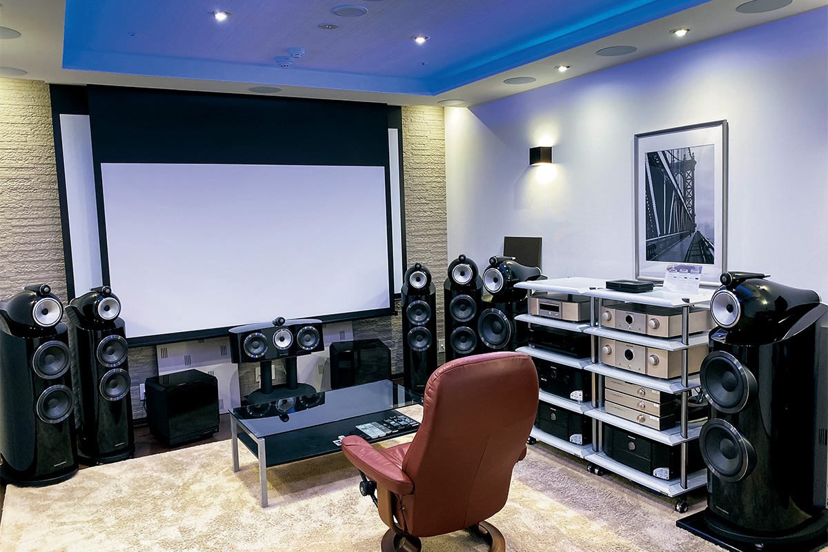 音響もハイエンドな構成となっており、メインの7.1chはBOWERS & WILKINS「800シリーズ」で統一。さらに、天井には6本のスピーカーを設置して7.1.6chとし、Dolby Atmosの再生にも対応しています。臨場感あふれるサウンドに包まれ、まさに劇場さながらの環境を実現しました。