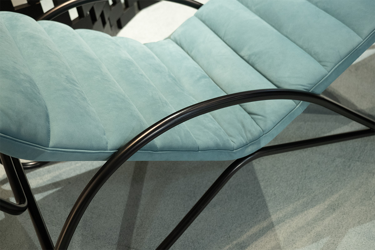 美学、特徴、サイズを保ちながら現代の住宅にふさわしいフレッシュで現代的なスタイルに刷新。金属製のチューブフレームが新しい深みのある光沢をまとう赤、青、緑を仕上げています。各モデルのフレームの色に合わせて張地のテクスチャもそれぞれ異なるものを採用しており、「2 Fauteuil Grand Confort, petit modèle」および「3 Fauteuil Grand Confort, grand modèle」は柔らかなモヘアベルベット、「1 Fauteuil dossier basculant」と「4 Chaise longue à réglage continu」は、上質なサドルレザーのシートが使用されています。