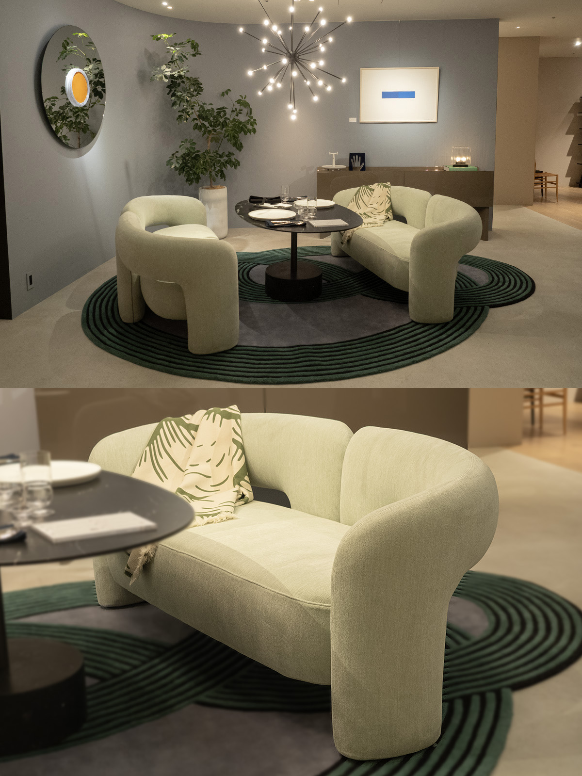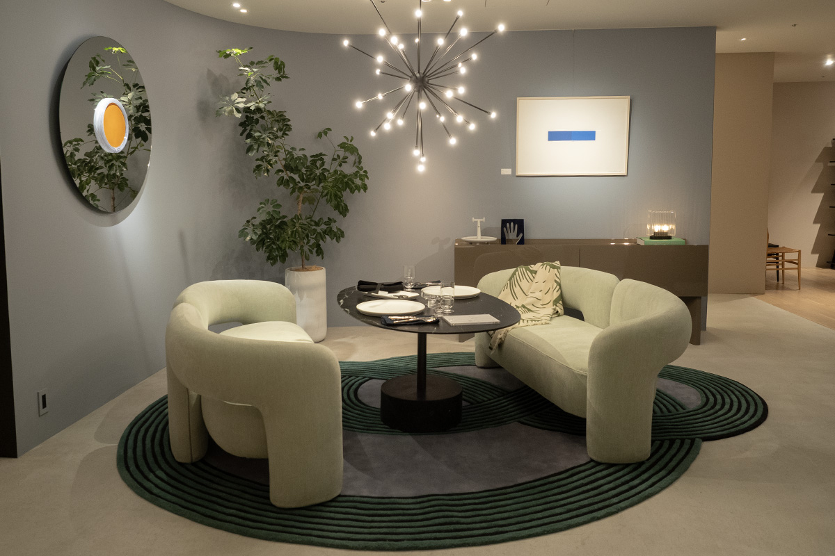 - 2階はシーンに合わせたコーディネートが楽しめます。パトリシア・ウルキオラ氏が手がけた「DUDET」は新しくソファタイプが登場。組み合わせてダイニングシーンを演出しています