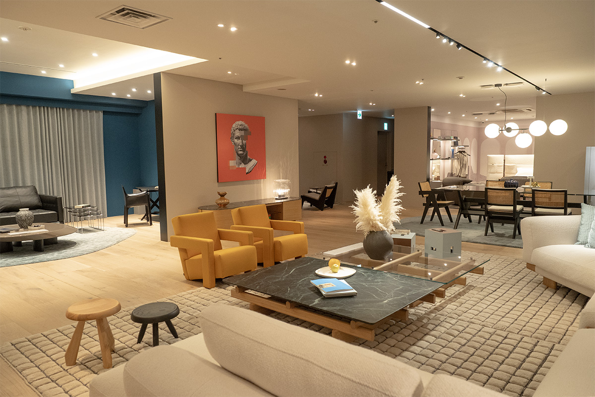 またショールームには、一般的なインテリアショップと比べると “色” を多くつかったインテリアが展示されていました。これは現在カッシーナのアートディレクターであるパトリシア・ウルキオラ氏の方針で「お店はお客さまが見て楽しむ場所だから」と、深く印象に残るものを取り入れているそうです。