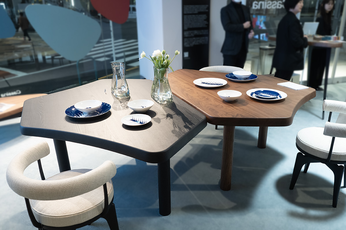 カッシーナ・イクスシー青山本店では、リビングやダイニング、ベッドルーム、ホームオフィスなど、シーンごとのコーディネートが展示されていました。新作家具はカッシーナらしく、20世紀初頭に活躍したシャルロット・ペリアン作品の復刻に加えて、現在ブランドのアートディレクターを務めるパトリシア・ウルキオラの新作など、歴史的背景もさまざまに感じられる多彩なアイテムが揃っています。