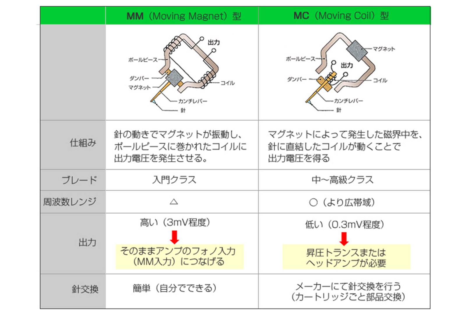 構造的にシンプルなのはMM型です。出力が高く、3mV以上あるのでそのままアンプのフォノ入力にインプットできるのです。針交換も簡単で、すっと抜いて市販の交換針をさしこむだけ。入門クラス向きのカートリッジといえるでしょう。