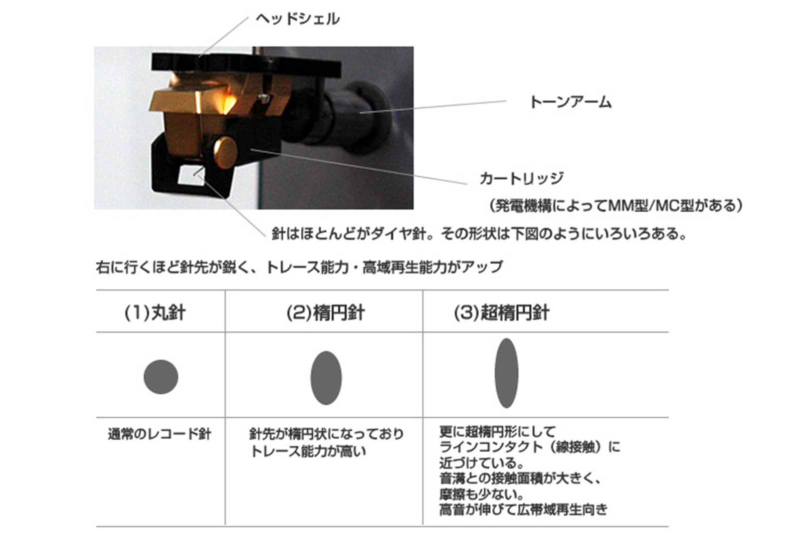 - DENON「DL-103」に代表される標準の丸針のほか、楕円針など、何タイプかにわかれます