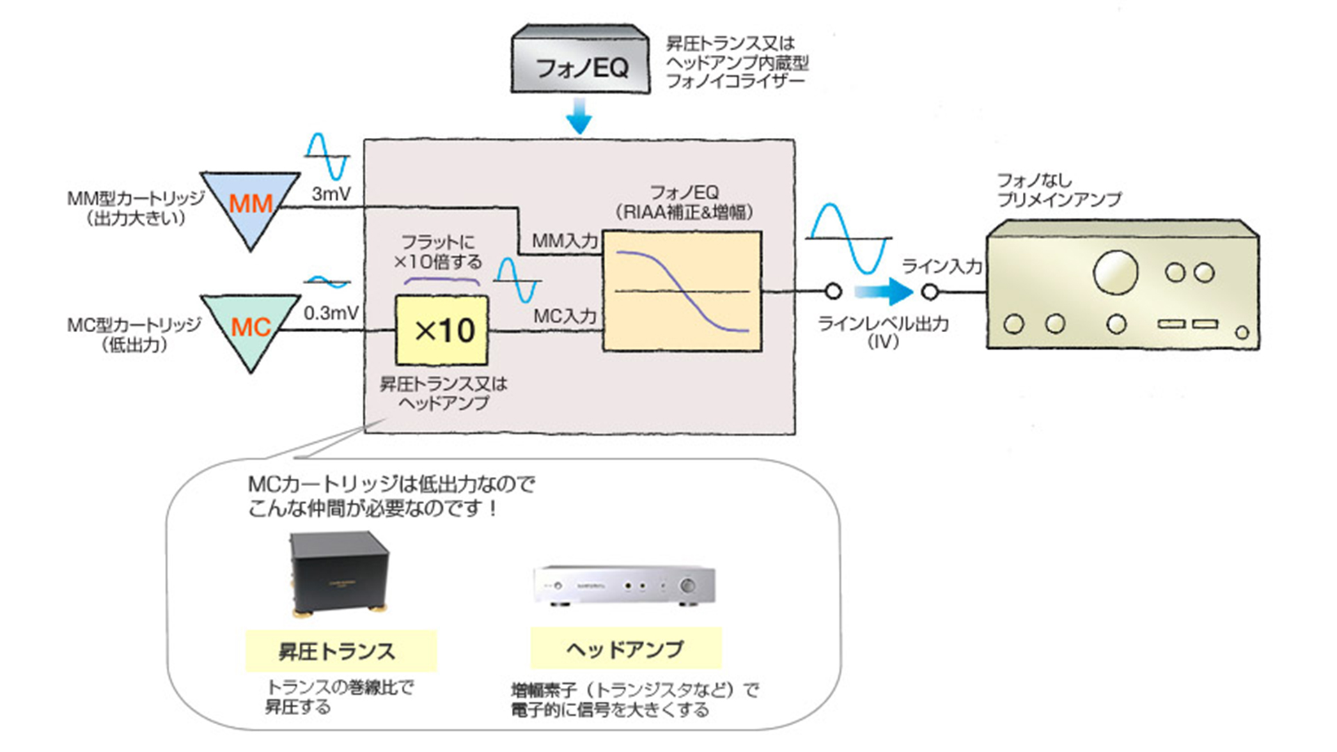 入門者には、アナログ再生に欠かせないフォノイコライザーと、これらの昇圧アイテムとの関係が少しわかりづらいのではないでしょうか? 信号の流れにそって整理してみましょう。前回学んだように、フォノイコライザーはあくまでレコードのRIAAカーブを「ロー上げハイ下げ」の補正カーブで元どおりにフラット化するための回路。もし手持ちのカートリッジが出力の高いMM型だったら、そのままフォノイコライザーに「MM入力」としてインプットできるのです。