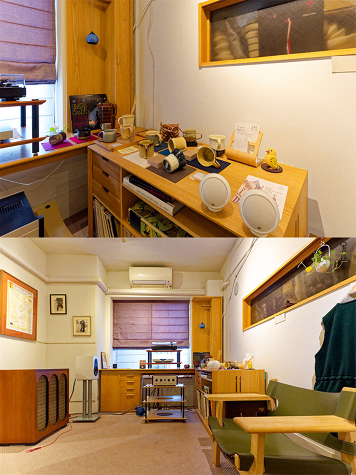 誘われるままに並木通り側の大きな窓に向いたスワンチェアに座ると、温かい珈琲から立ち上る湯気とともに、透き通るようなコーラスが流れています。シェードから差し込む光とも相まって荘厳なイメージ。竹田さんはチャキチャキとシェードを操作するので、その開け具合が絶妙な調音効果をも及ぼしているのでしょう。