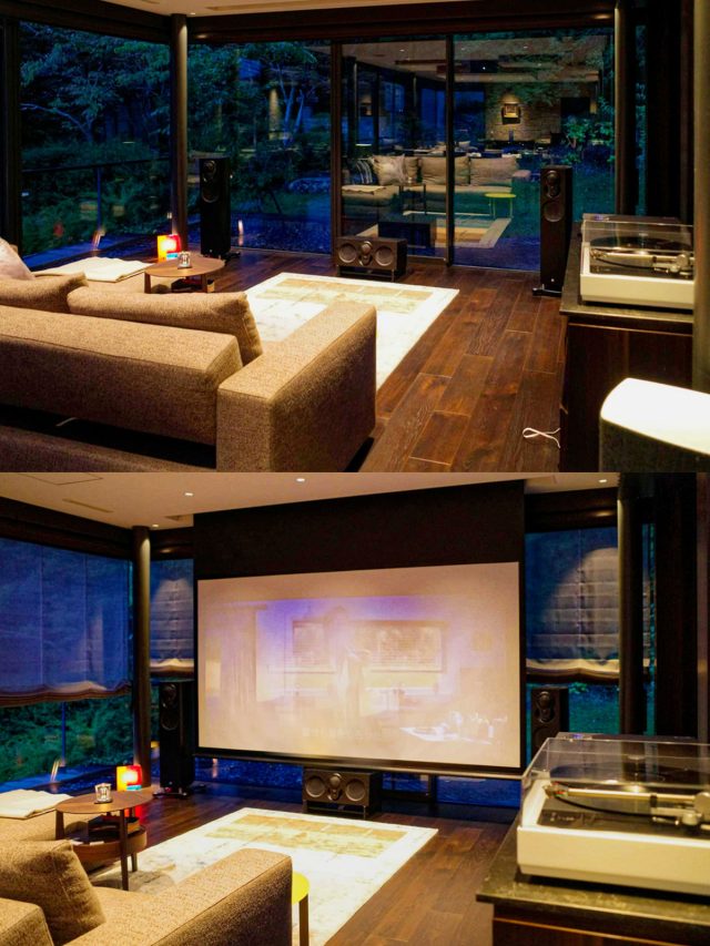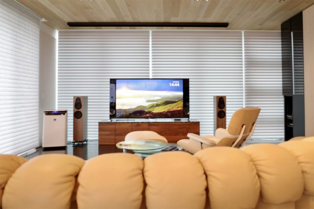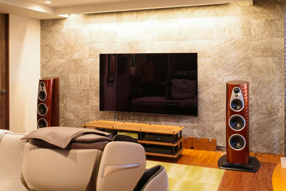 さらに、数十年来LINNシステムとAVアンプを別荘に導入済のユーザーで、最近EXAKTを体験して東京の自宅に導入したという例もあります。B邸は、購入した別荘にもともとLINNのフロア型スピーカー「AKURATE 242」のサラウンド(AVアンプ駆動の5.1ch)システムが入っていたオーナーが、東京の自宅を新築するにあたり「SELEKT DSM」にサラウンドモジュールを搭載してサラウンドを構築した実例。プロジェクターにVICTOR「DLA-Z5」、メインスピーカーにLINNのフロア型「150」という最新システムで、リア用の埋込スピーカーと組み合わせた4chを構成しています。「ものすごくシンプルなのに、音がイイ!」と好評とのこと。家族団欒でソファに腰掛けて映画鑑賞するようすが目に浮かびます(詳細はこちらから)。