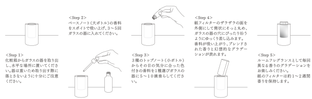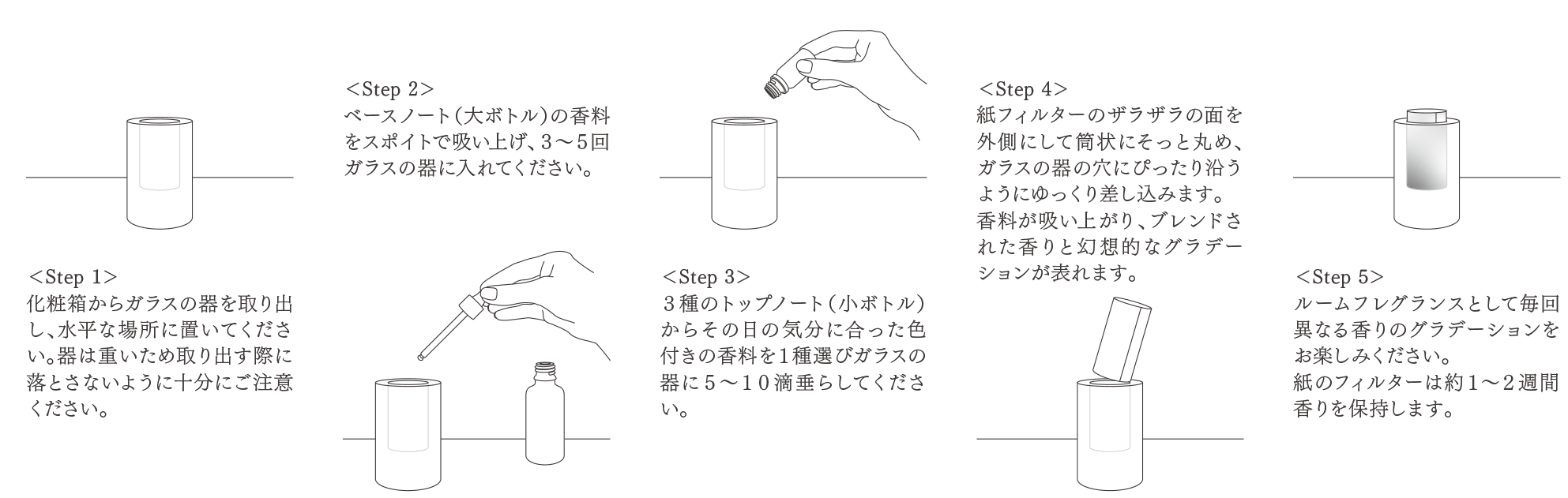 これによって香料が吸い上げられ、ブレンドされた香りとともに、MIXカラーがグラデーションを描き広がっていきます。あたかもこじれていた感情がほどけていくように、香りも変化しつつ、1〜2週間香りを持続します。