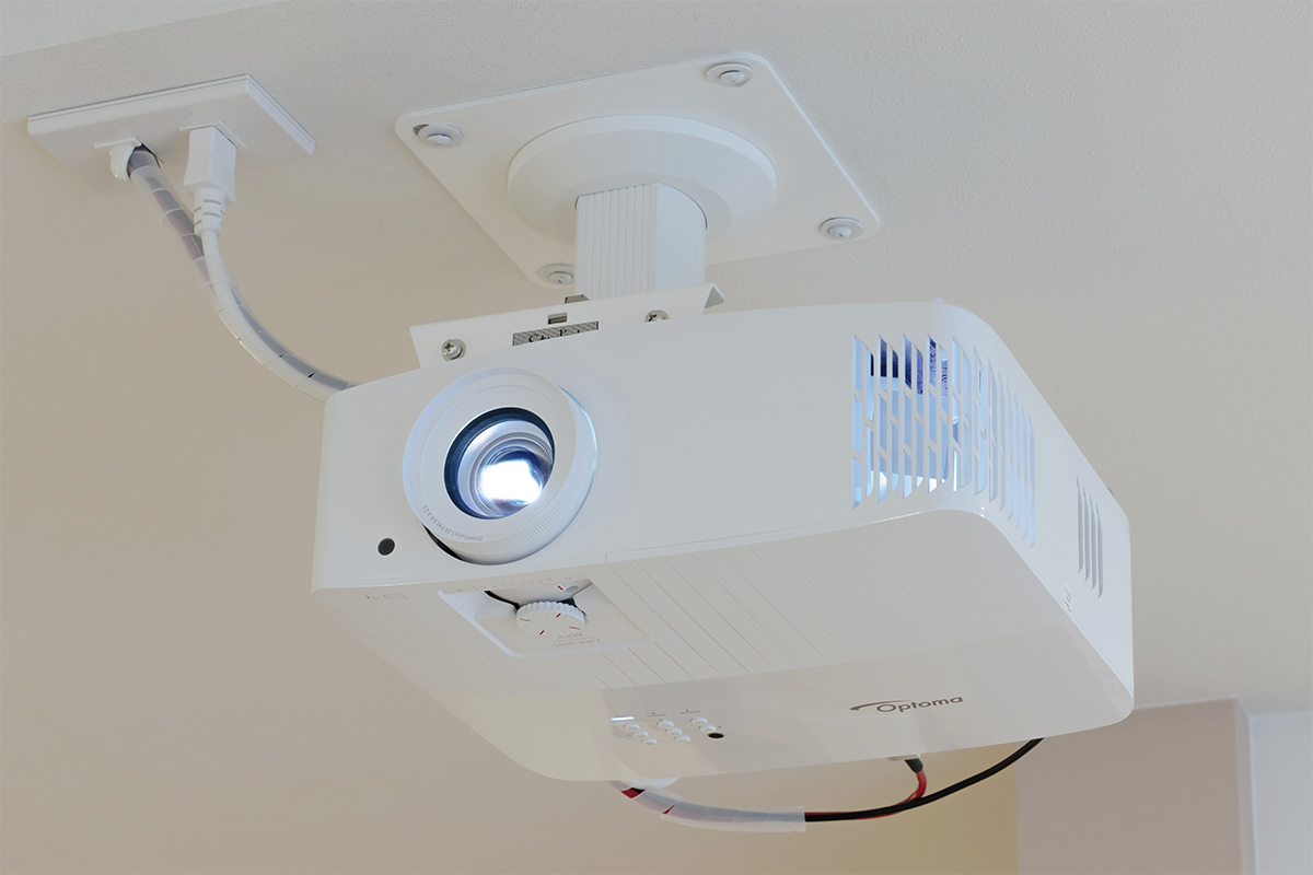 横長の間取りでプロジェクターの投写距離を稼ぐことが難しかったため、宮﨑氏はハウスメーカーと打ち合わせを重ねながら、設置位置を微細に調整。投写距離の短いオプトマの「UHD-55」を選びつつ、若干お部屋の外に出した位置に設置することで、120インチの大画面投写を実現しました。