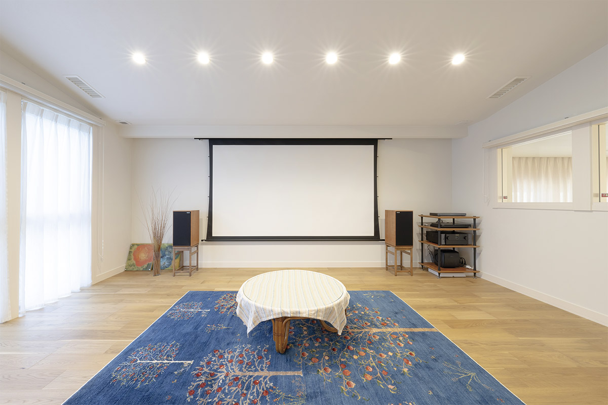 ●住宅形態:戸建/新築 ●ホームシアターの広さ:約12畳 ●画面サイズ:120インチ ●サラウンド:4.1ch ●インストール内容:機器設置、システムプランニングほか