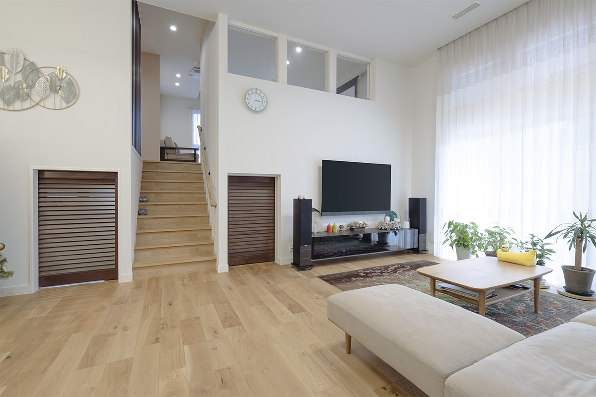 Mさんの住まいはミサワホームの「蔵のある家」。ホームシアターがつくられたのは、スキップフロアを上がった中二階のセカンドリビングです。柔らかな陽の光が差し、落ち着いた色調のインテリアで統一されたくつろぎ感たっぷりの空間に、機器が美しく調和しています。