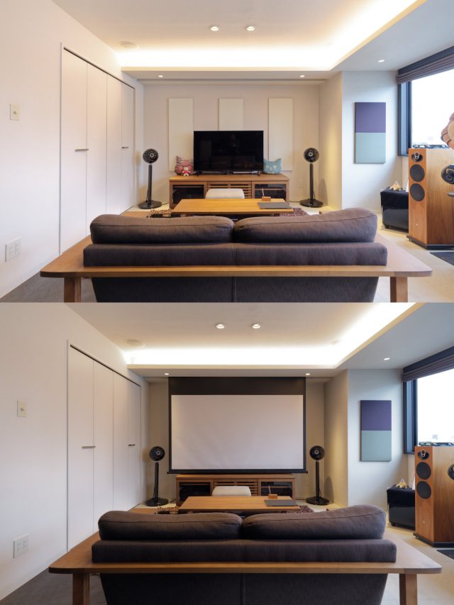 - プロジェクターはネイティブ4K画質と設置性のバランスを両立させた最新鋭のビクター「DLA-Z5」。使うときだけ露出させるプロジェクター昇降機も対応可能なので、ご予算と天井の懐に余裕があればオススメです